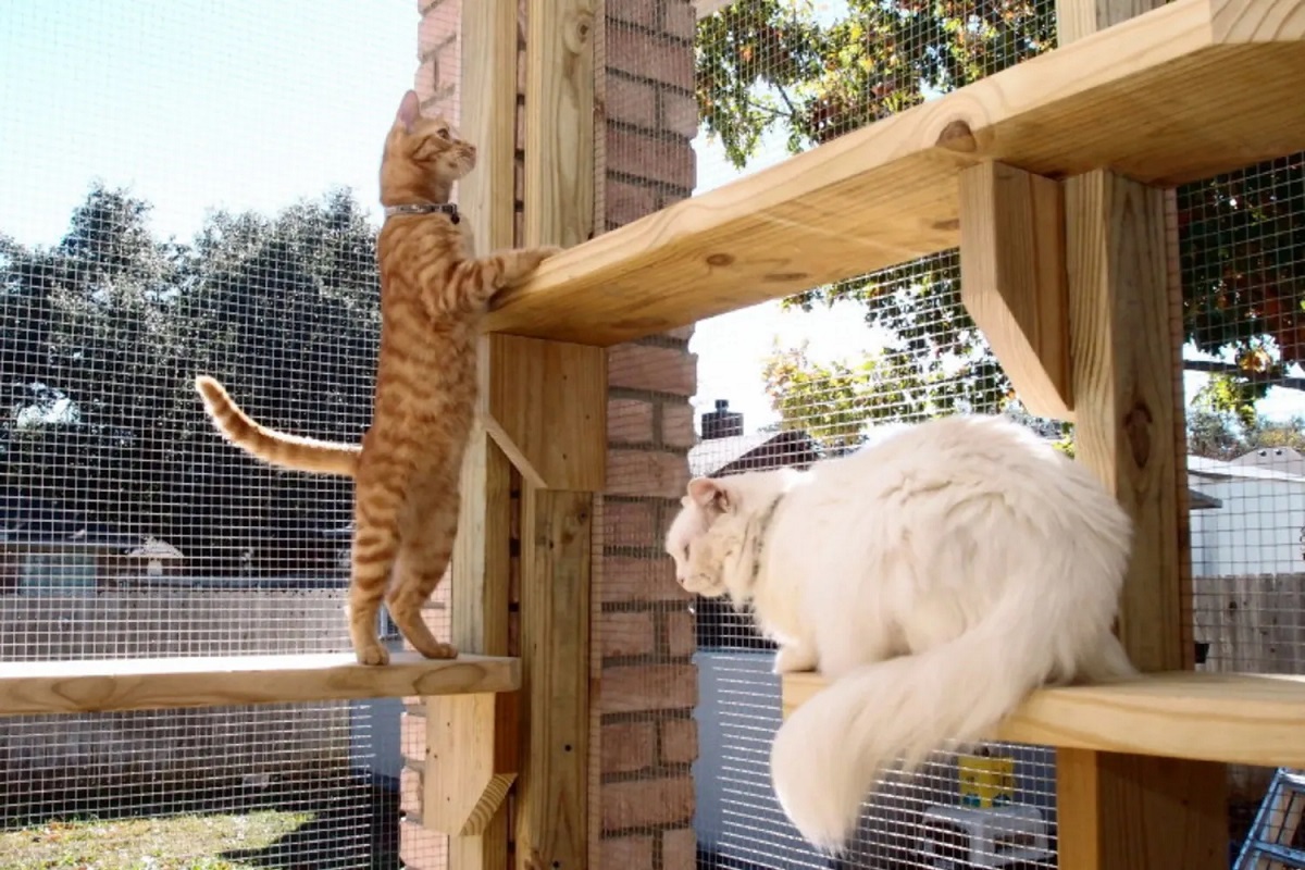 The energy in this porch is palpable, thanks to the mix of bold colors and textures that reflect a free-spirited lifestyle. It’s a space designed for creativity and enjoyment, where your cats can lounge on soft pillows and explore their surroundings in a vibrant environment.