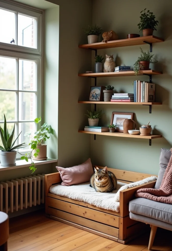 Imagine a cozy living room corner where a vintage wooden crate transforms into a charming cat bed, lined with soft, plush fabric. This design draws upon warm earth tones that create an inviting atmosphere, enhanced by a large window that casts gentle, diffused light across the space.