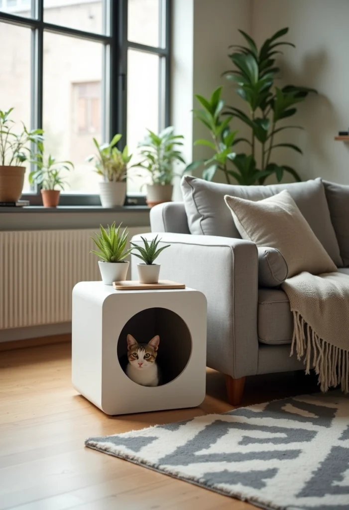 Imagine a modern living room where functionality meets style. A sleek, minimalist litter box cleverly disguised as a chic side table sits beside a cozy gray sofa, creating an inviting atmosphere.