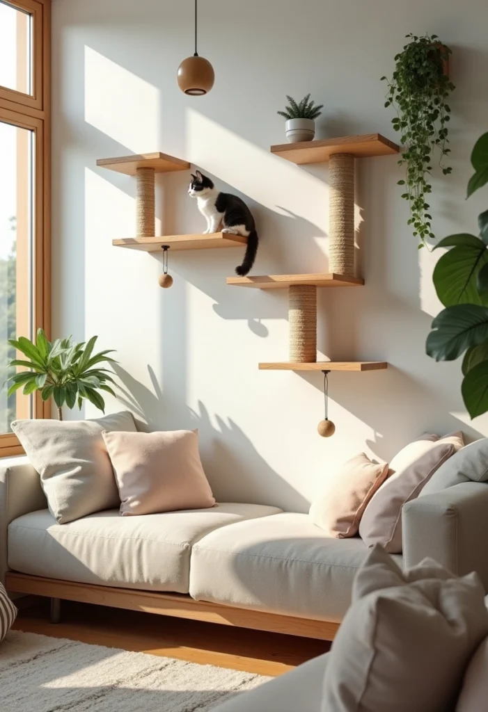 - Incorporate floating shelves that double as cat perches.